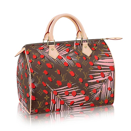 Palm Springs emblematic Palm trees evoke a Monogram Jungle... This refreshing & joyful pattern combines Stylish palm theme from the Cruise 2016 collectsion and dots evoking wild and tropical animals passing through palm leaves. The Speedy 30 combines the iconic Monogram with a light & feminine print. Wild and cool, it is perfect for a trendy and bright summer style.