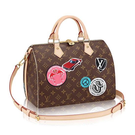 Designed for travelers in 1930 (the name is a nod to the era's rapid transit), with a strap for casual cross-body wear, todays Speedy 30 is a perfect city bag supple, lightweight and forever in style. This version in Monogram coated canvas features Creative Director Nicolas Ghesquieres playful take on classic hotel stickers, which Gaston-Louis Vuitton used to collects during all his travels.