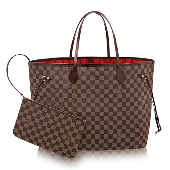 Legendary Neverfull: always exactly what you need it to be. Capacious but not bulky, structured yet supple, at home on the town or in the country. Cinch the side laces, and voila! it's a sleek city bag. Loosen them and you have a chic, practical tote. The slim leather handles fit over the shoulder or on the arm. Shown here in Damier Ebene canvas.