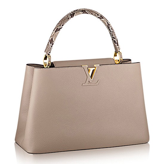 It was on the Rue des Capucines in Paris that thefirst Louis Vuitton store opened its doors. As timeless as the House itself,the Capucines bag brings chic sophistication to any look. Full-grain Taurillonleather combines with precious python to create a luxurious handbag accentedwith heritage details: the LV initials, the distinctive side rings and thesubtle Monogram flower on the closing flap. Its capacious interior makes thebag an ideal companion for a day of business or shopping.