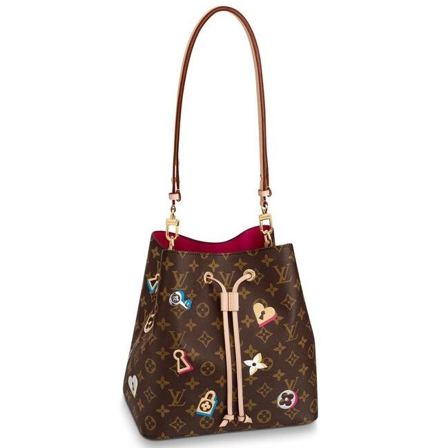 - Monogram coated canvas with gold- or silver-tone fused metallic-foil motifs- Natural cowhide-leather trim- Microfiber lining- Gold-color hardware- Long adjustable strap thanks to press button for shoulder or cross-body carry (drop: min. 33 cm/13 inches, max. 56 cm/22 inches)- Leather drawstring closure- Inside zipped pocketSize: 10.2 x 10.2 x 6.9 inchesComes with Louis Vuitton serial number, dust bag and authenticity card.